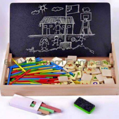 Bao gồm: 1 bảng 2 mặt – 1 mặt ghép , xem giờ và 1 mặt viết phấn, que tính, và phấn màu.